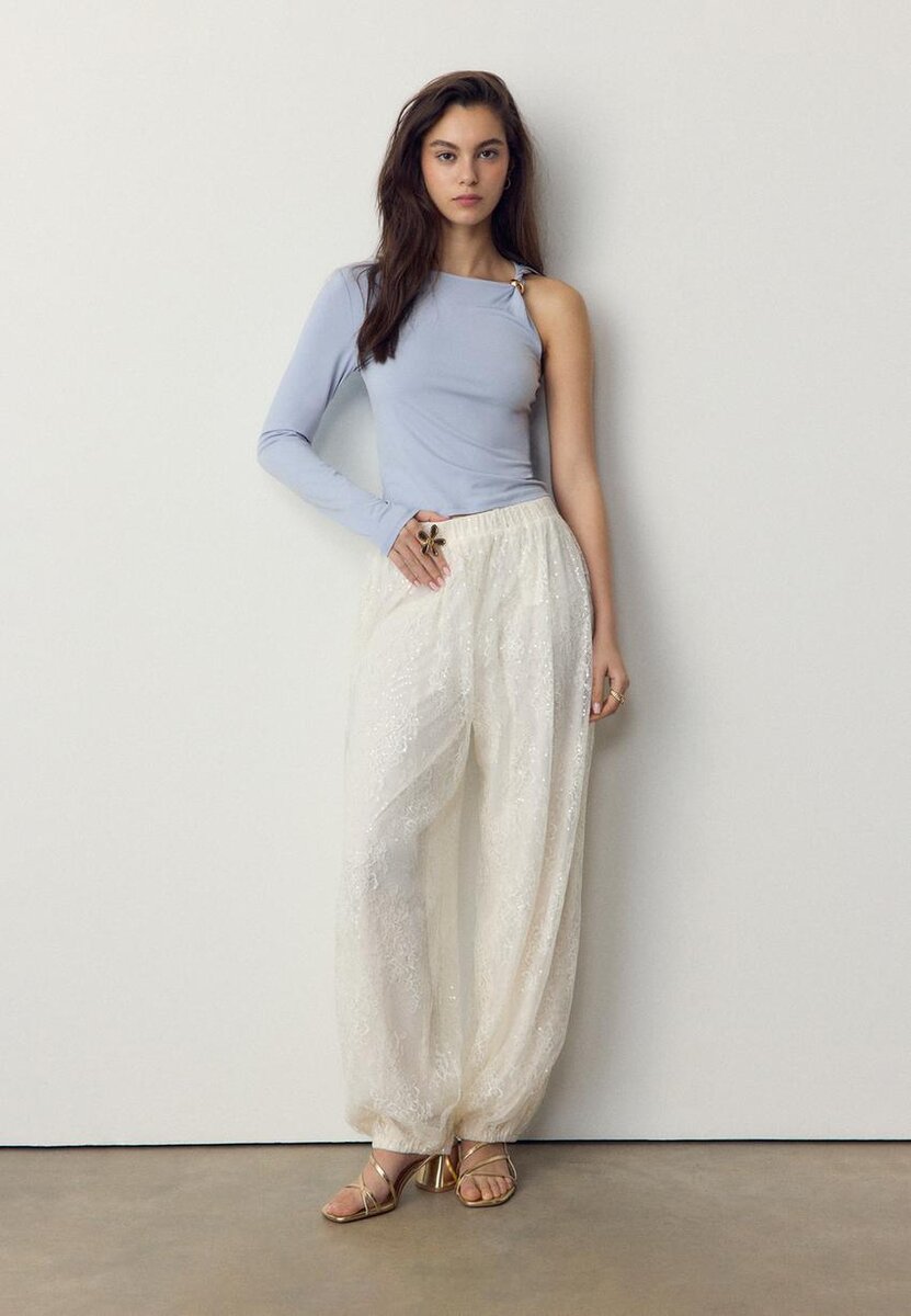Tričko s asymetrickým výstřihem a dlouhými rukávy. Na ramínku má kovovou sponu. K dispozici v několika barvách.
