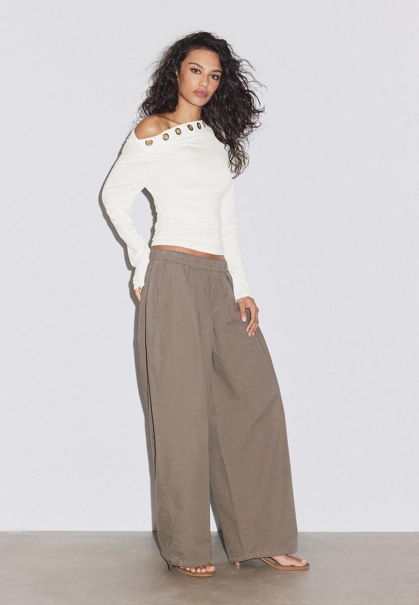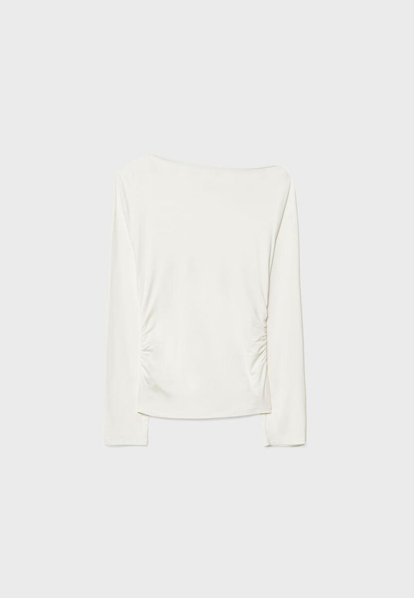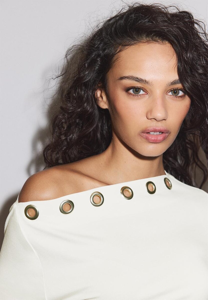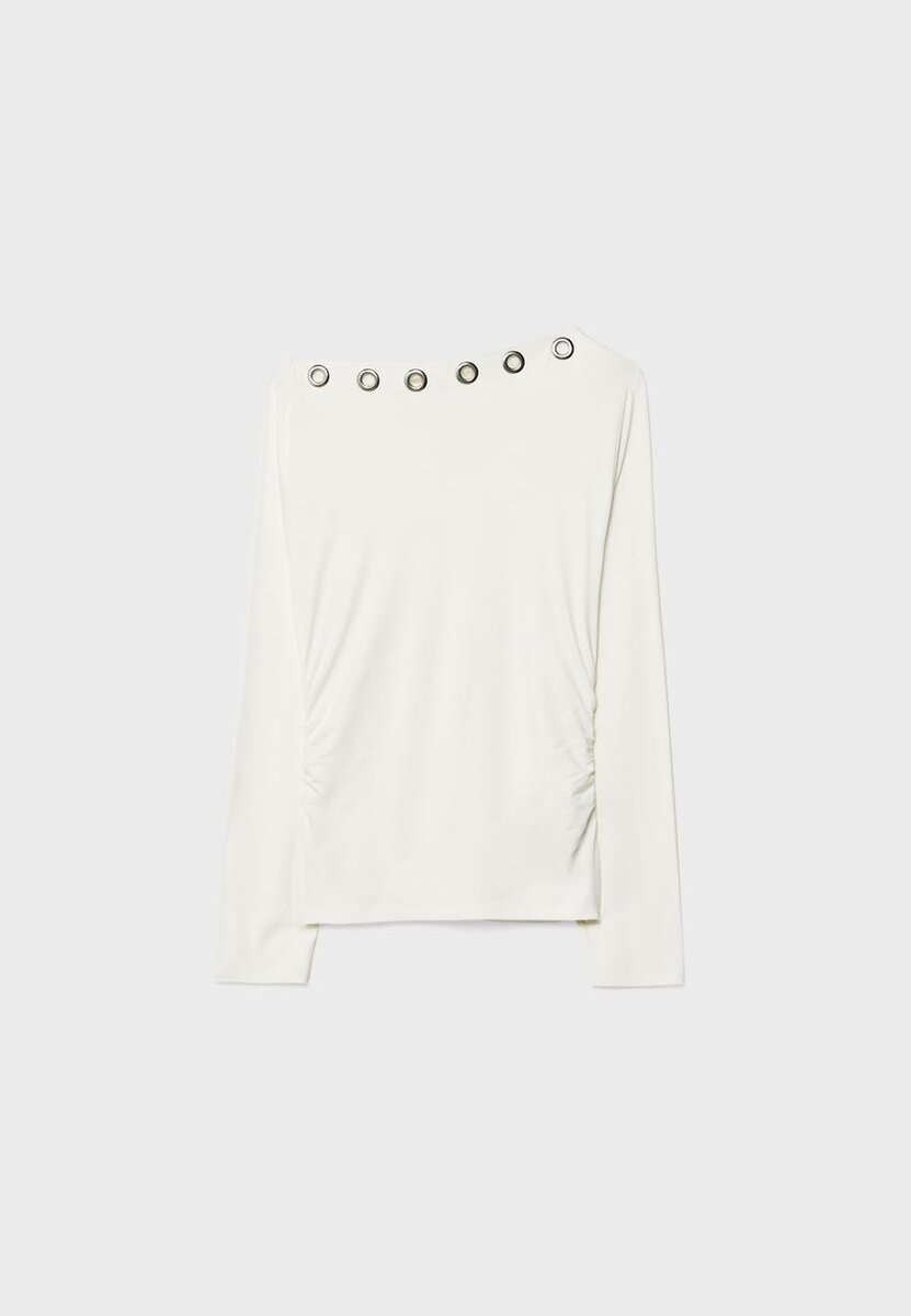 Přiléhavé tričko s asymetrickým výstřihem a dlouhými rukávy s jedním odhaleným ramenem. Kovové očka na přední straně a řasená látka po stranách. K dispozici v několika barvách.