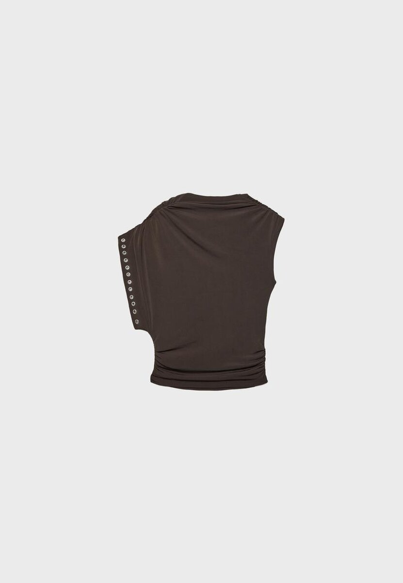 Asymetrický top bez rukávů s cvočky ve Stradivarius za pouhých 29,9 $ K dispozici po omezenou dobu. Null pro ženy Vždy v trendu, přijďte a objevte to hned teď!