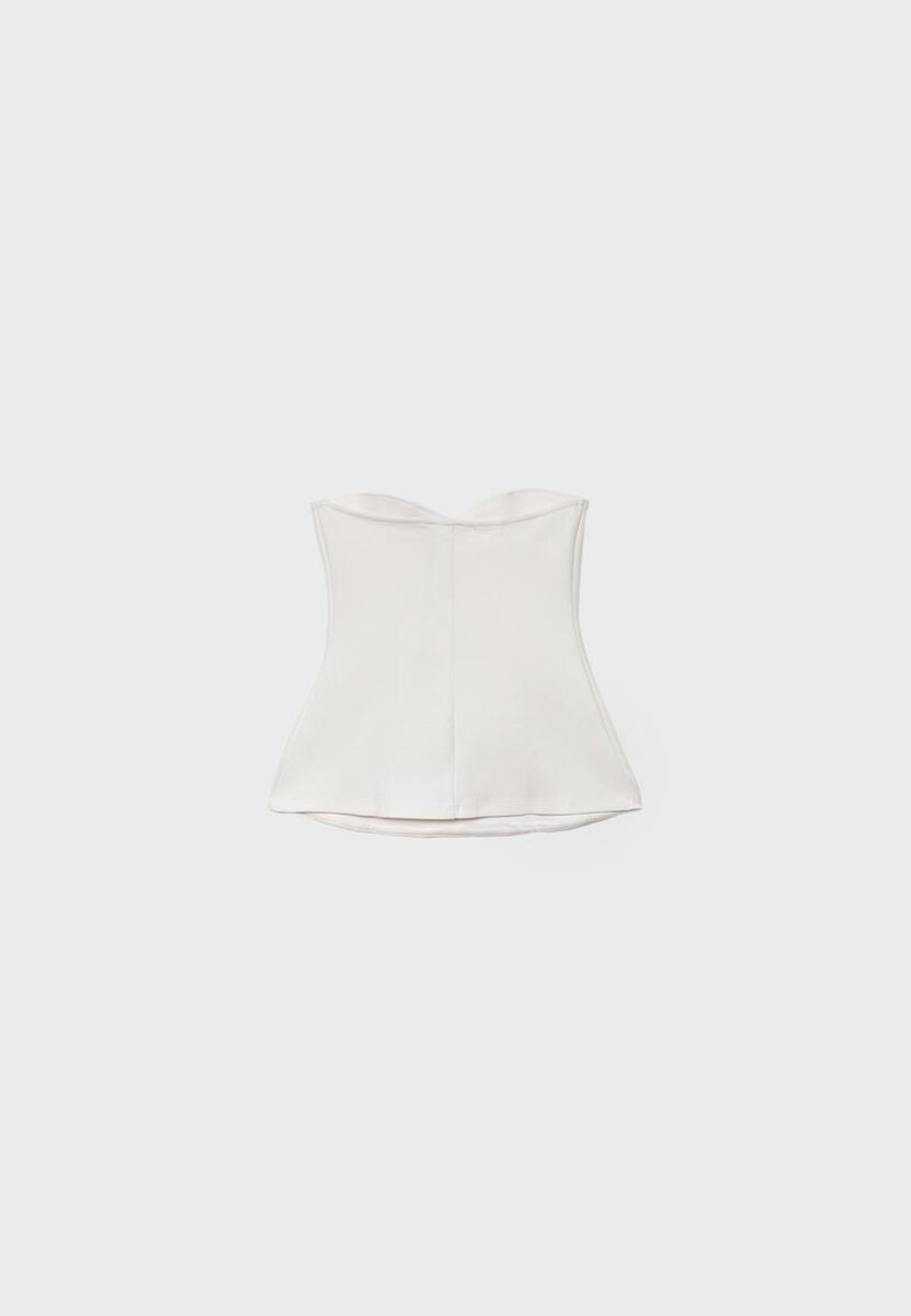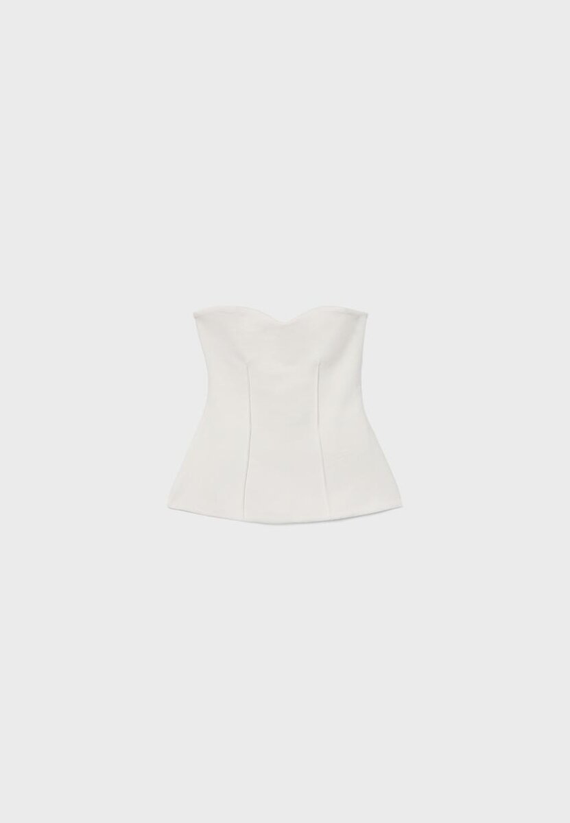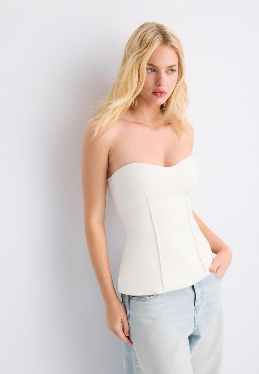 Přiléhavé bandeau. Výstřih do srdce. Viditelné švy. K dispozici v několika barvách.