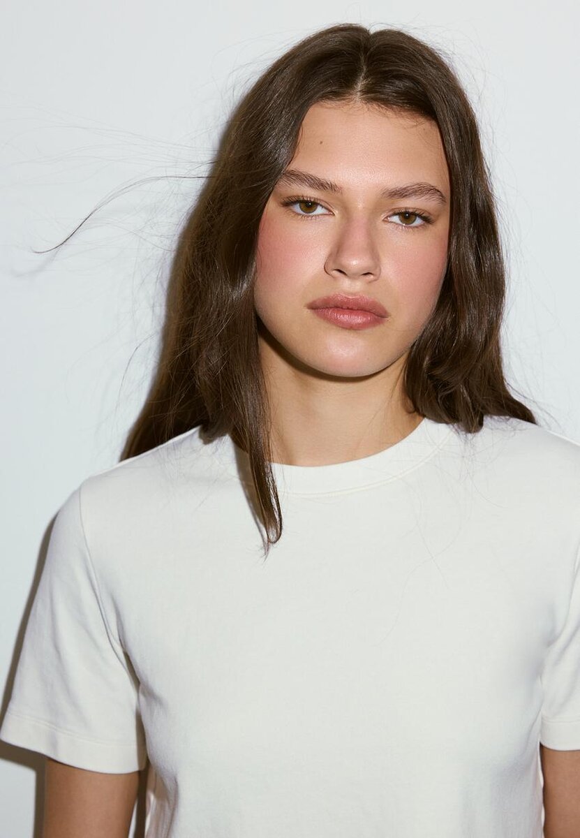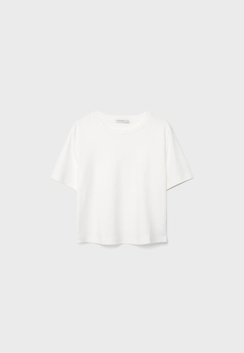 Basic tričko s rovným střihem a pravidelným střihem vyrobené z bavlněné látky. S kulatým výstřihem a krátkými rukávy. K dispozici v různých barvách.