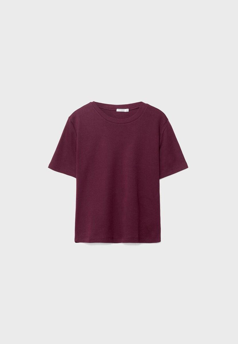 Basic tričko s rovným střihem a pravidelným střihem vyrobené z bavlněné tkaniny. S kulatým výstřihem a krátkými rukávy. K dispozici v různých barvách.