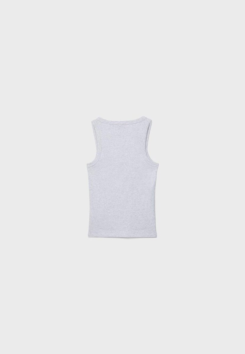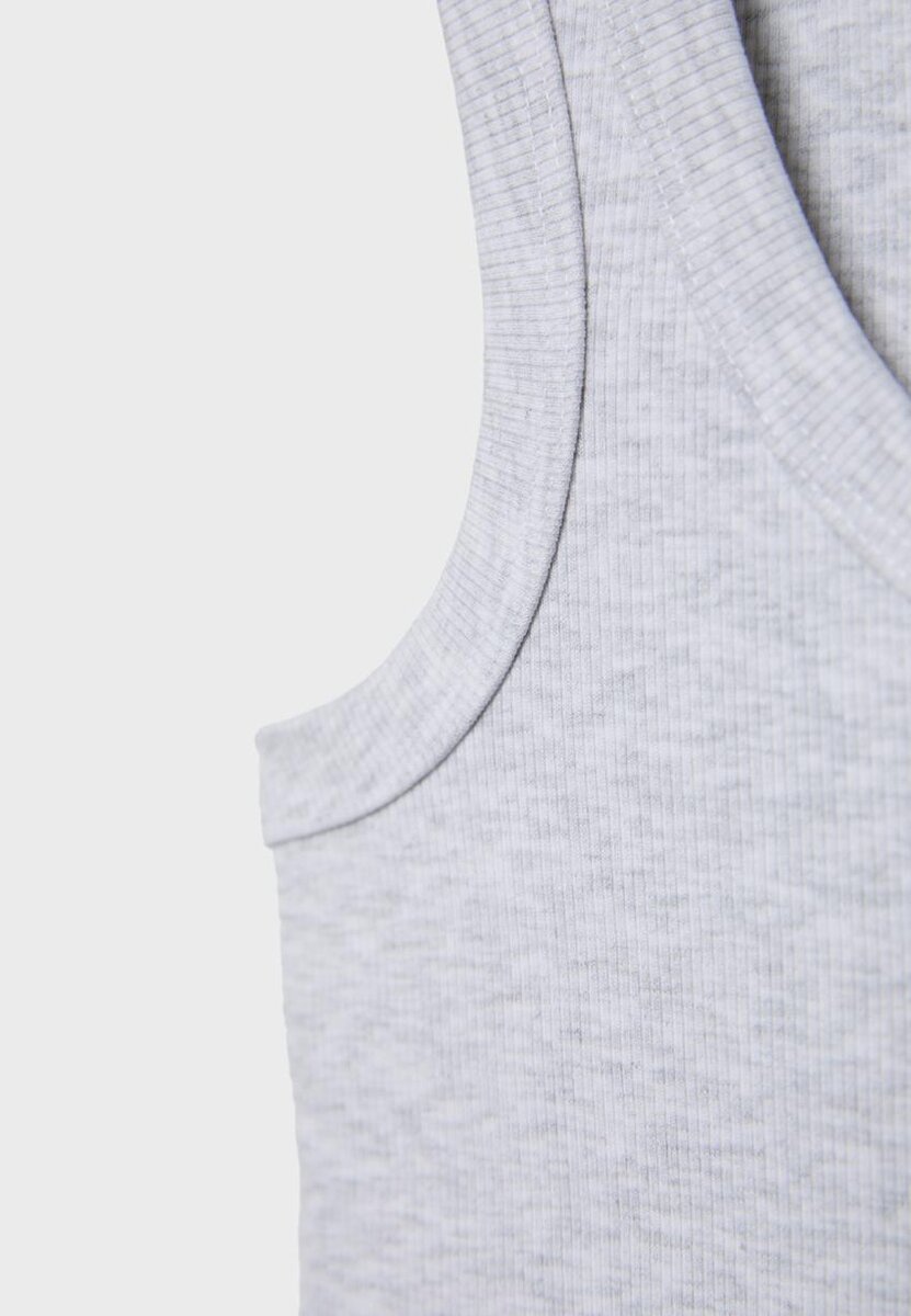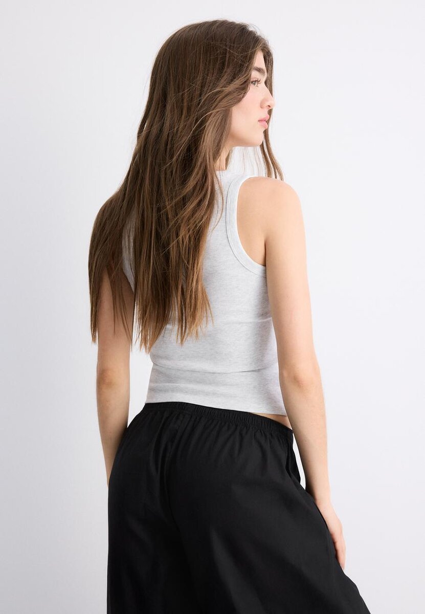 Přiléhavé tričko s racerbackem a kulatým výstřihem. Detail žebrovaného materiálu.