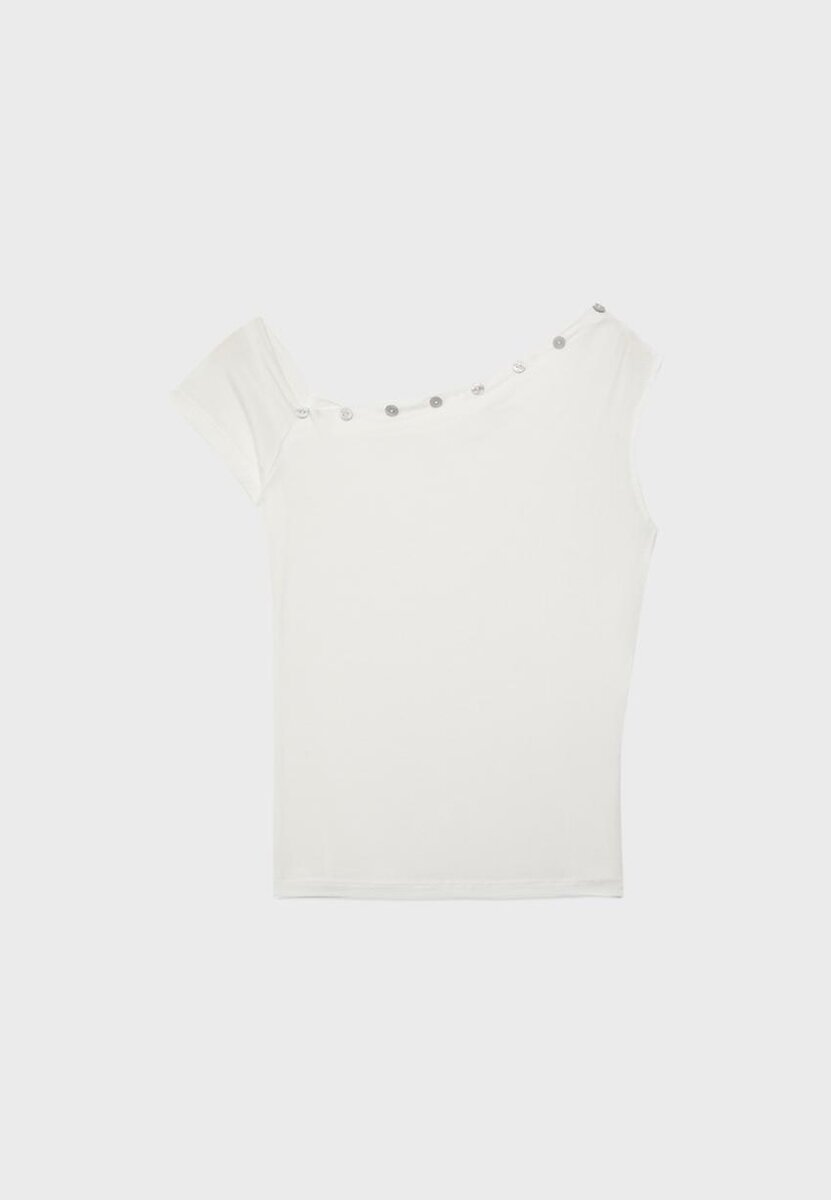 Přiléhavé tričko s asymetrickým výstřihem v kombinaci s krátkými rukávy a bezrukávovým designem. Knoflíkový detail na krku. K dispozici v několika barvách.