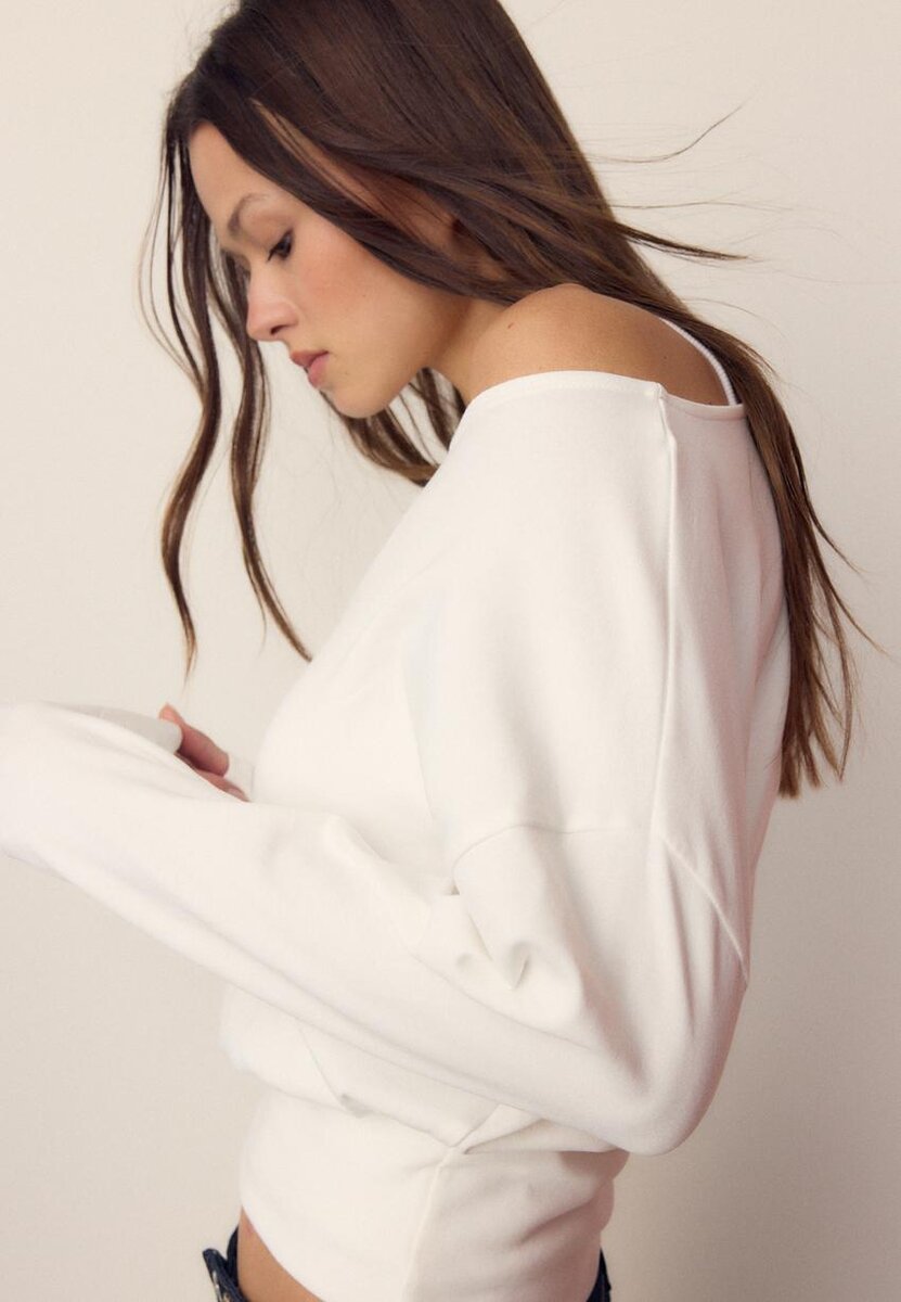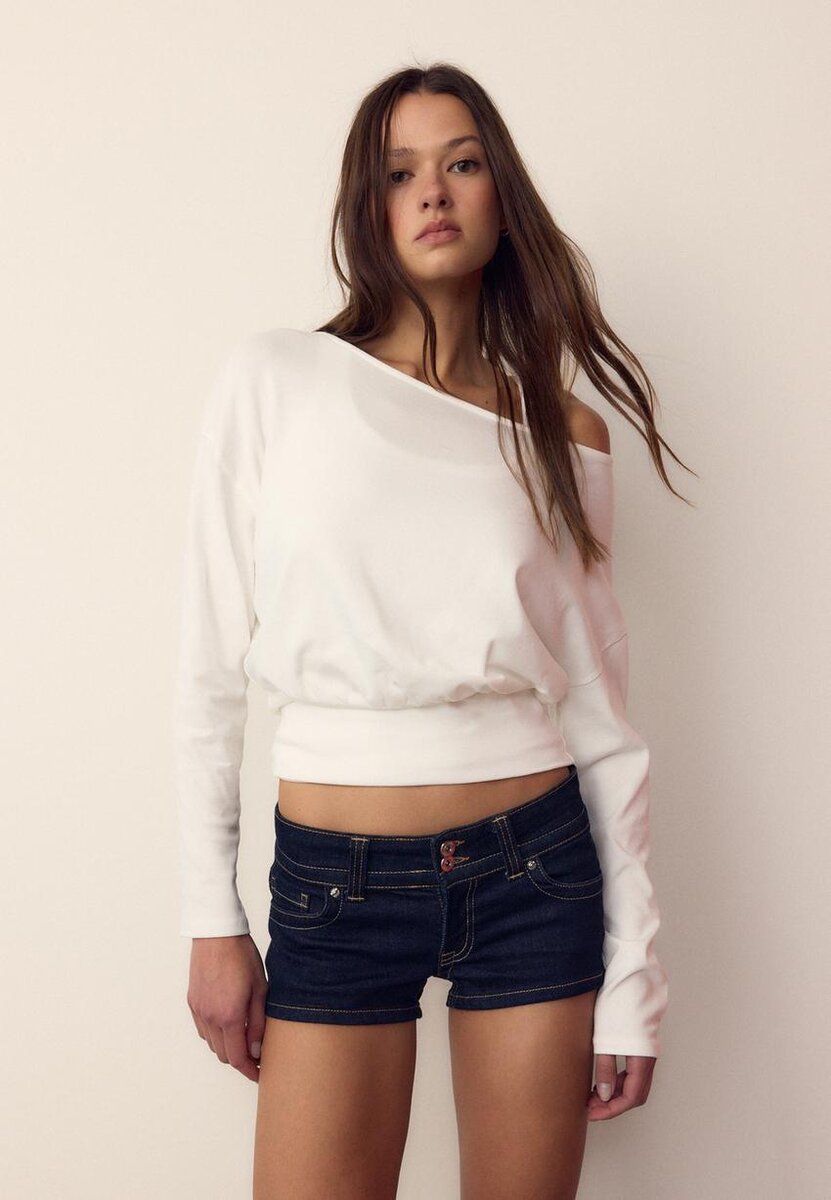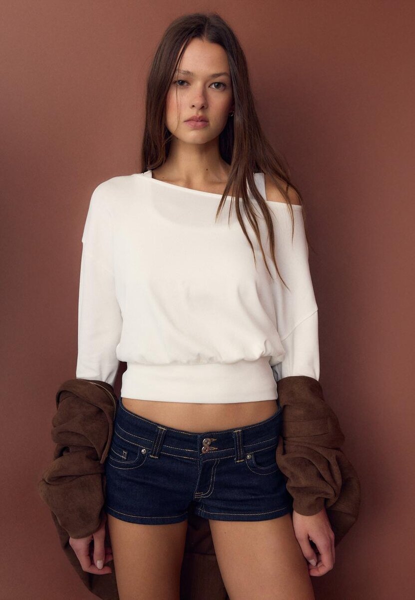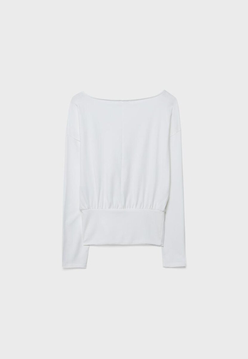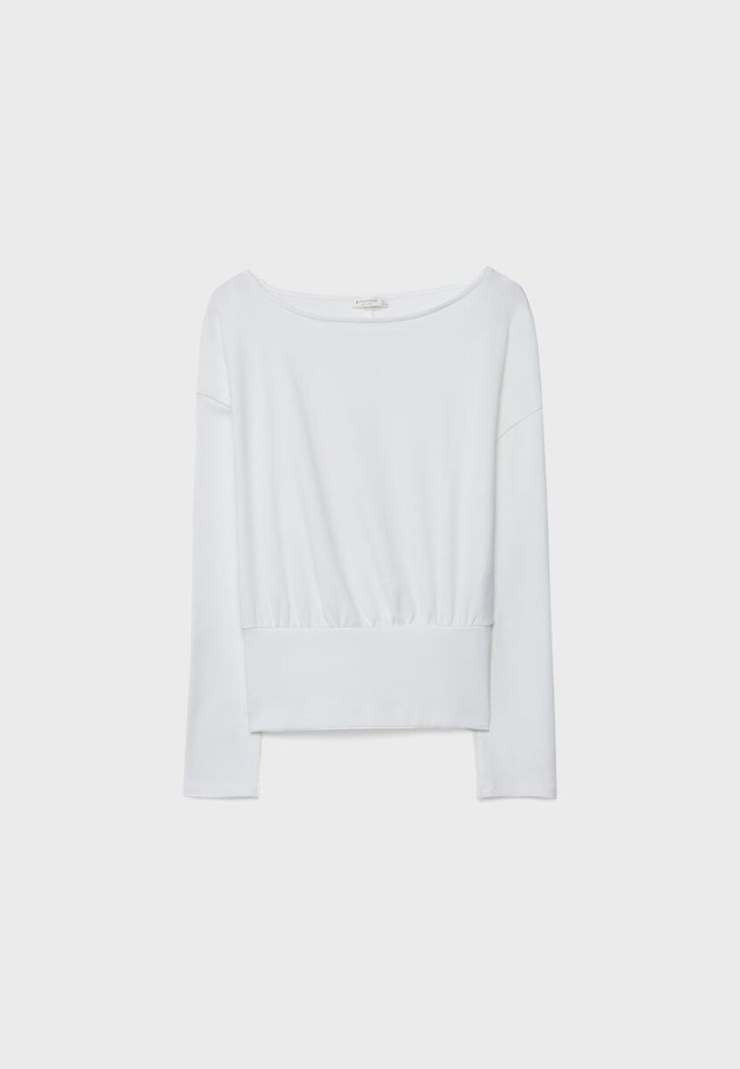 Tričko s dlouhým rukávem a lodním výstřihem. Má lem ve stylu cummerbundu. K dispozici v několika barvách.