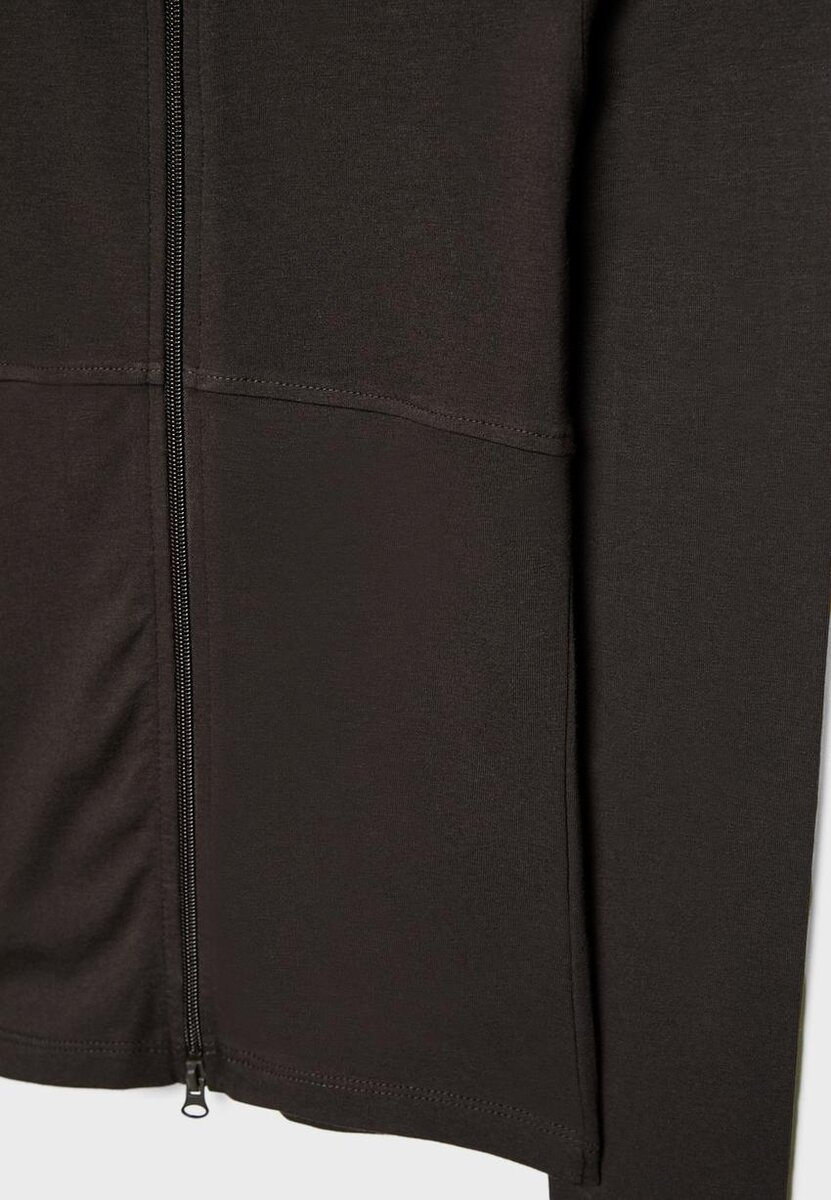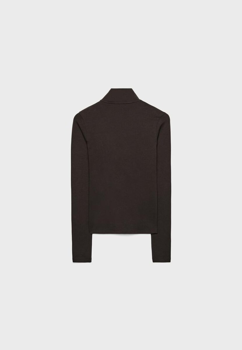 Tričko s dlouhým rukávem a vysokým výstřihem. Dvoucestný zip vpředu.