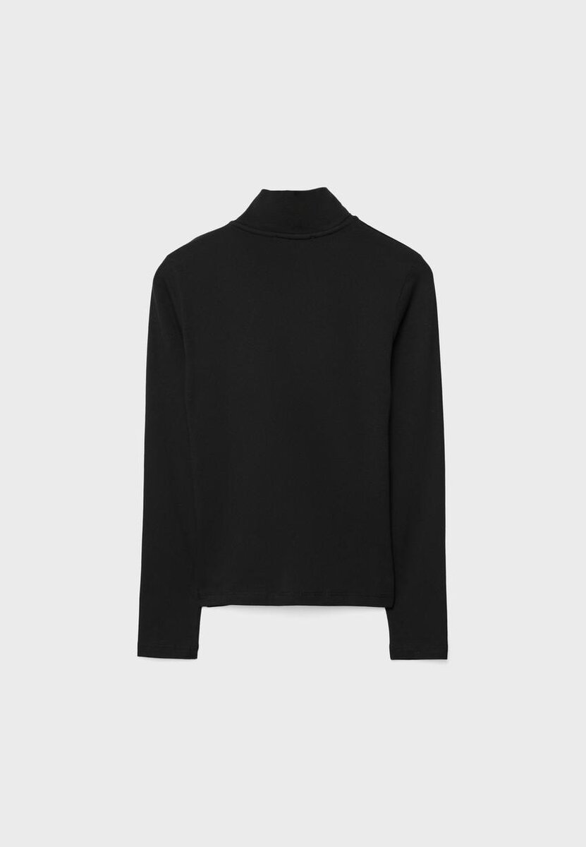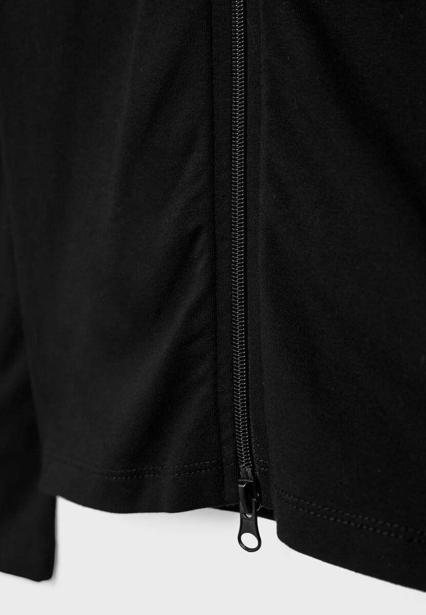 Tričko s dlouhým rukávem a vysokým výstřihem. Dvoucestný zip vpředu.