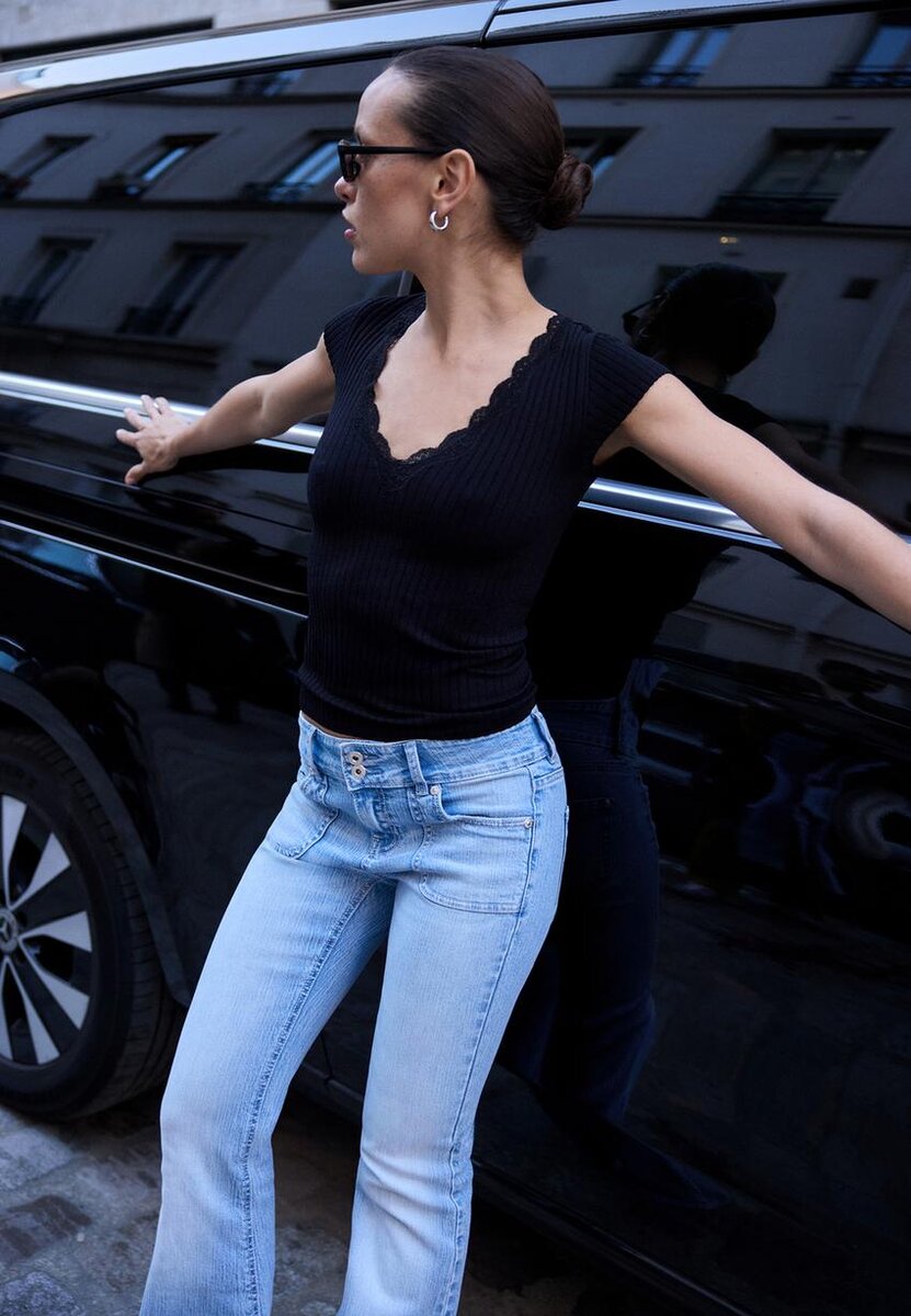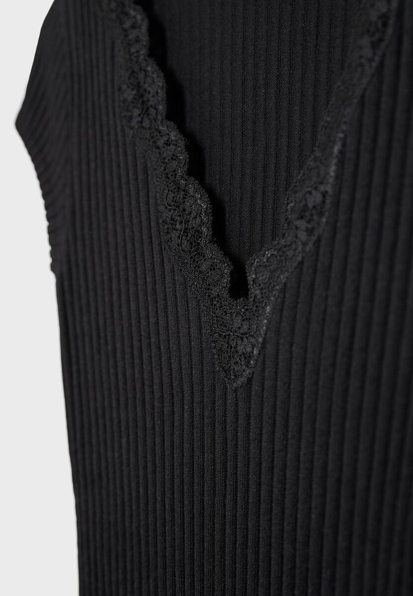 Přiléhavé žebrované tričko. Výstřih do V s krajkovým detailem a krátkými rukávy. K dispozici v různých barvách.