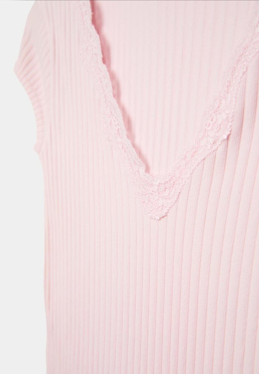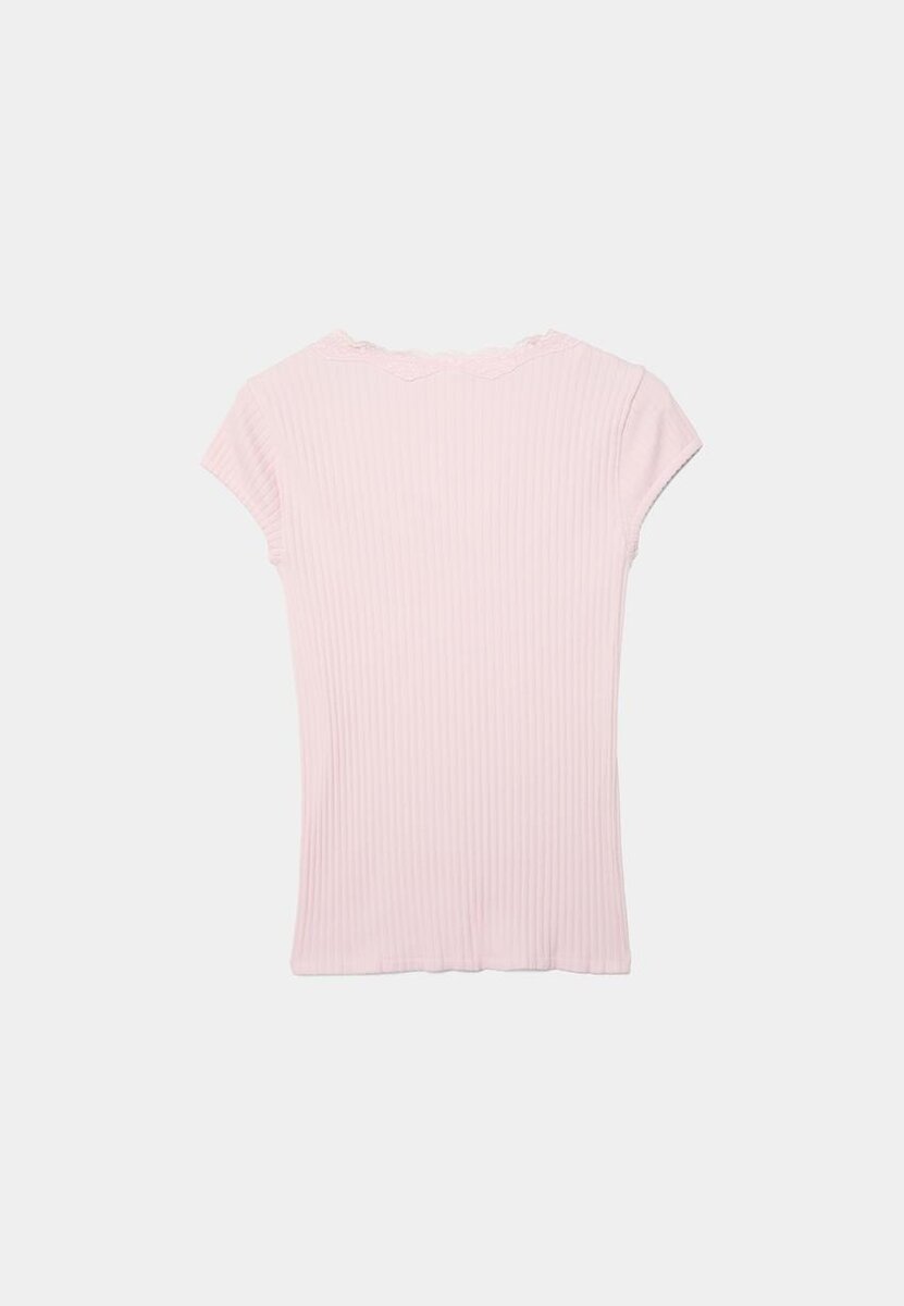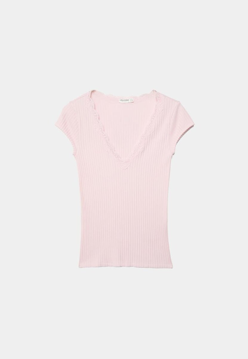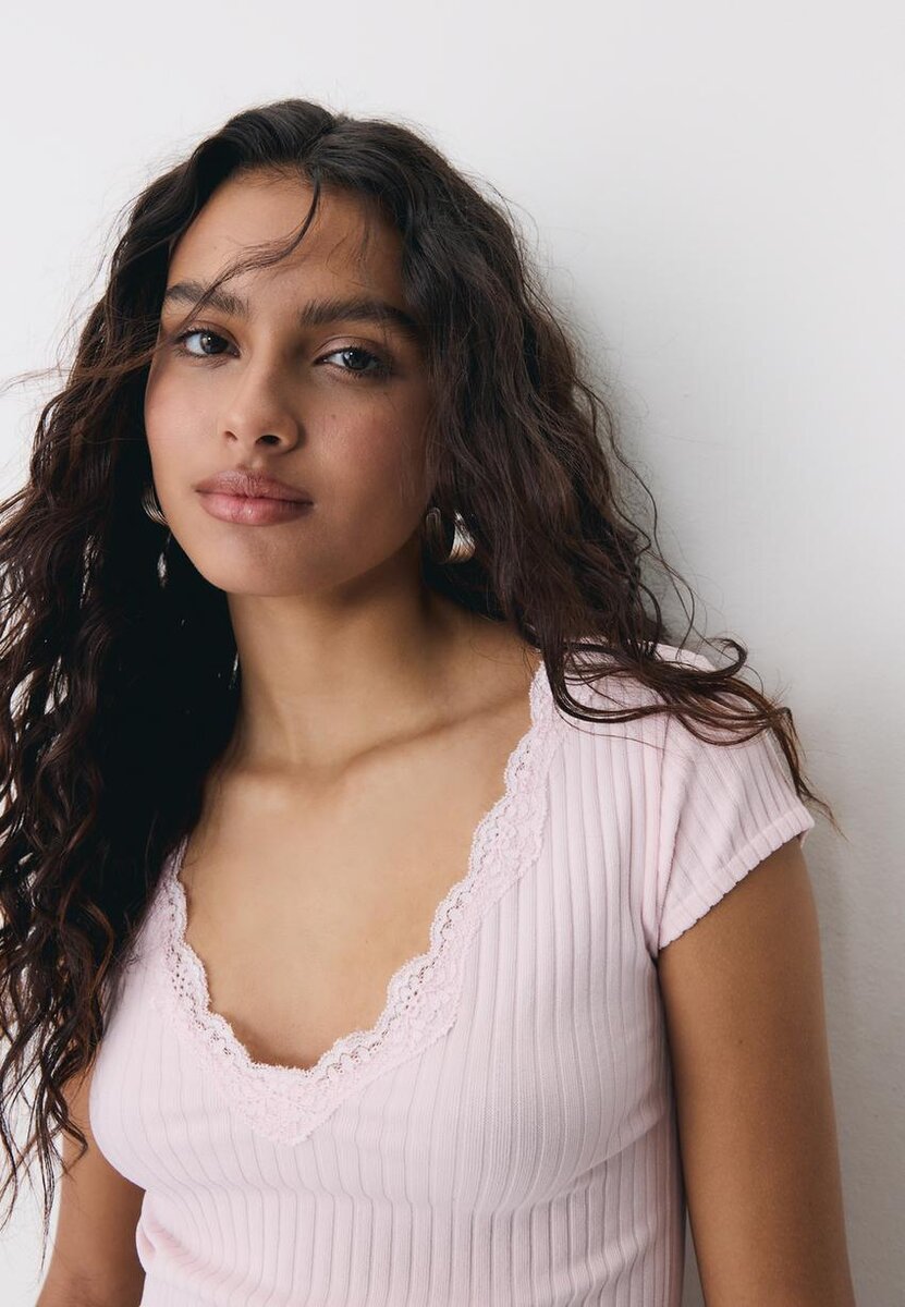 Přiléhavé žebrované tričko. Výstřih do V s krajkovým detailem a krátkými rukávy. K dispozici v různých barvách.