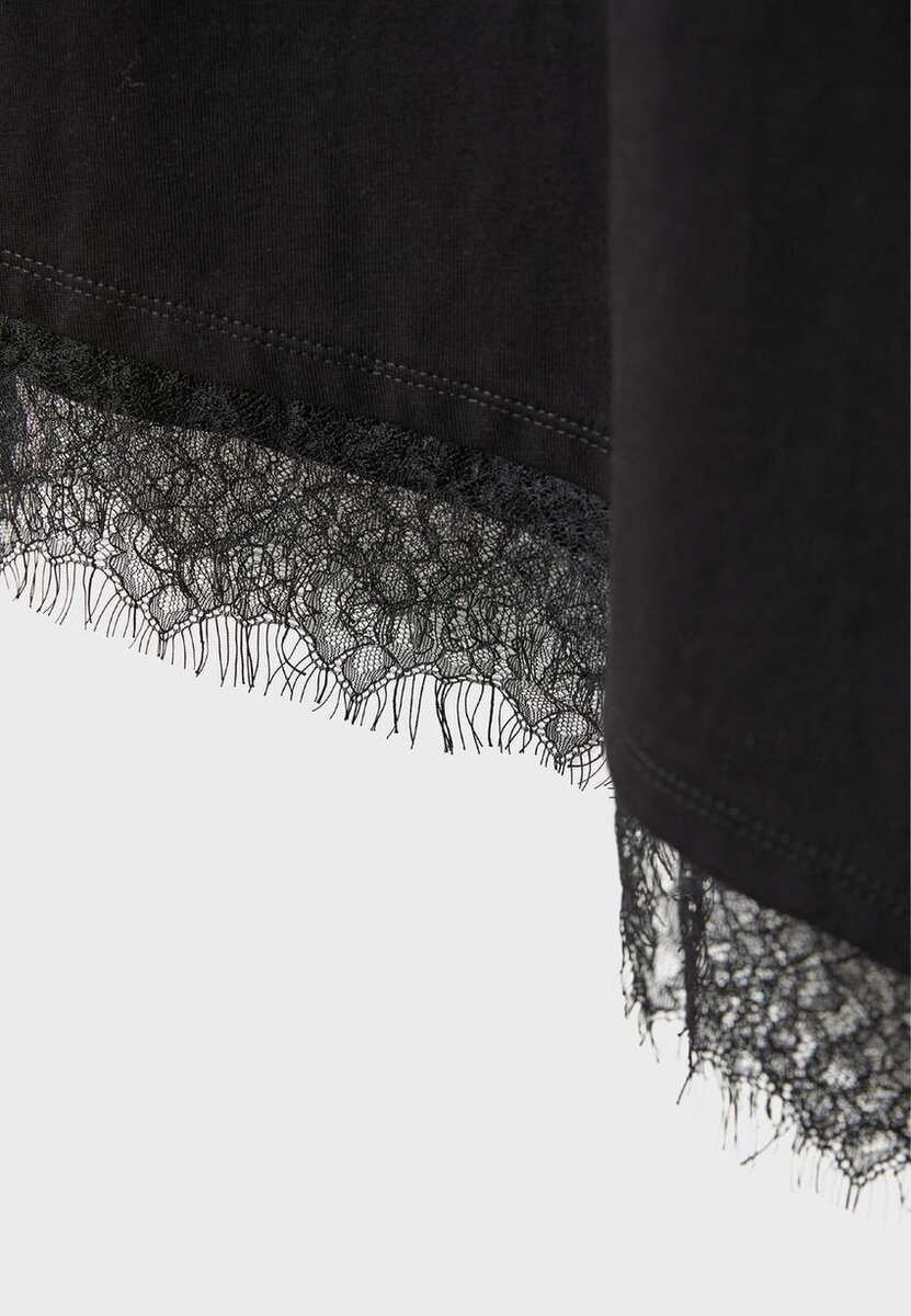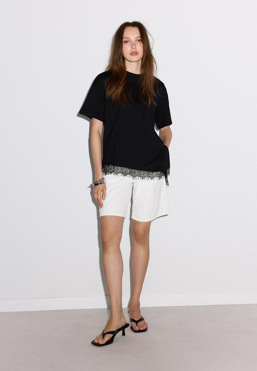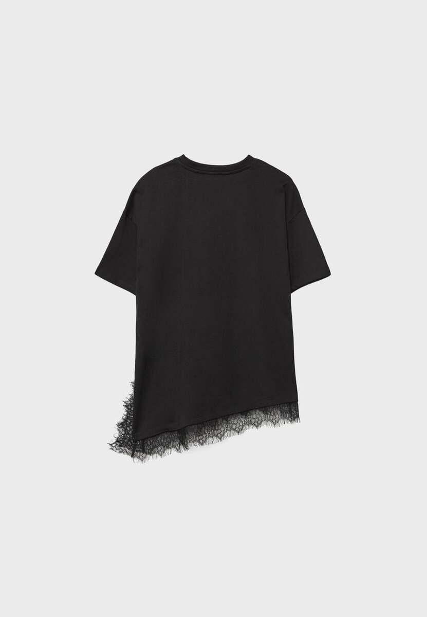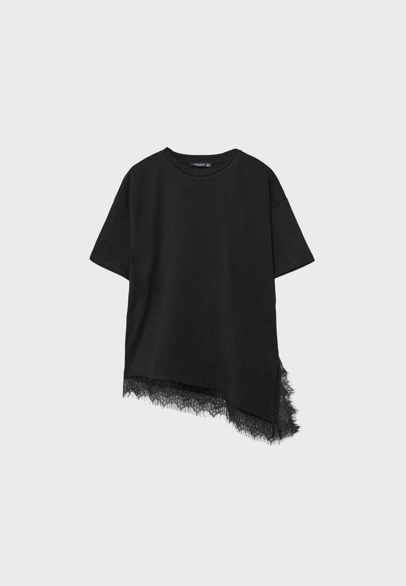 Oversize Tričko s kulatým výstřihem a krátkými rukávy. S asymetrickým lemem s krajkovým lemováním. K dispozici v různých barvách.