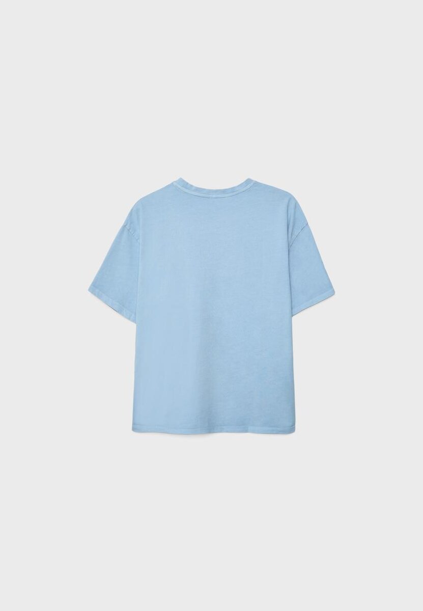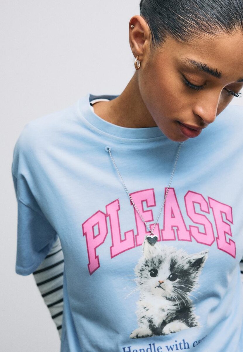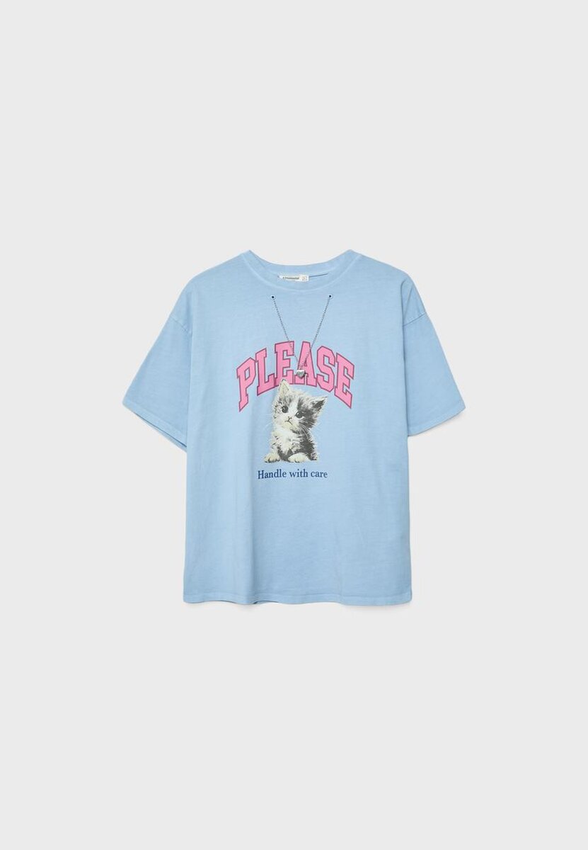 Tričko s kulatým výstřihem a krátkým rukávem. Má potisk na přední straně a řetízek s odnímatelnou nášivkou. K dispozici v několika barvách.