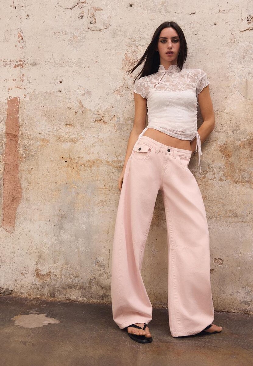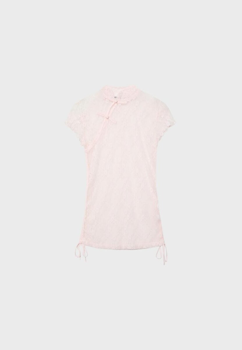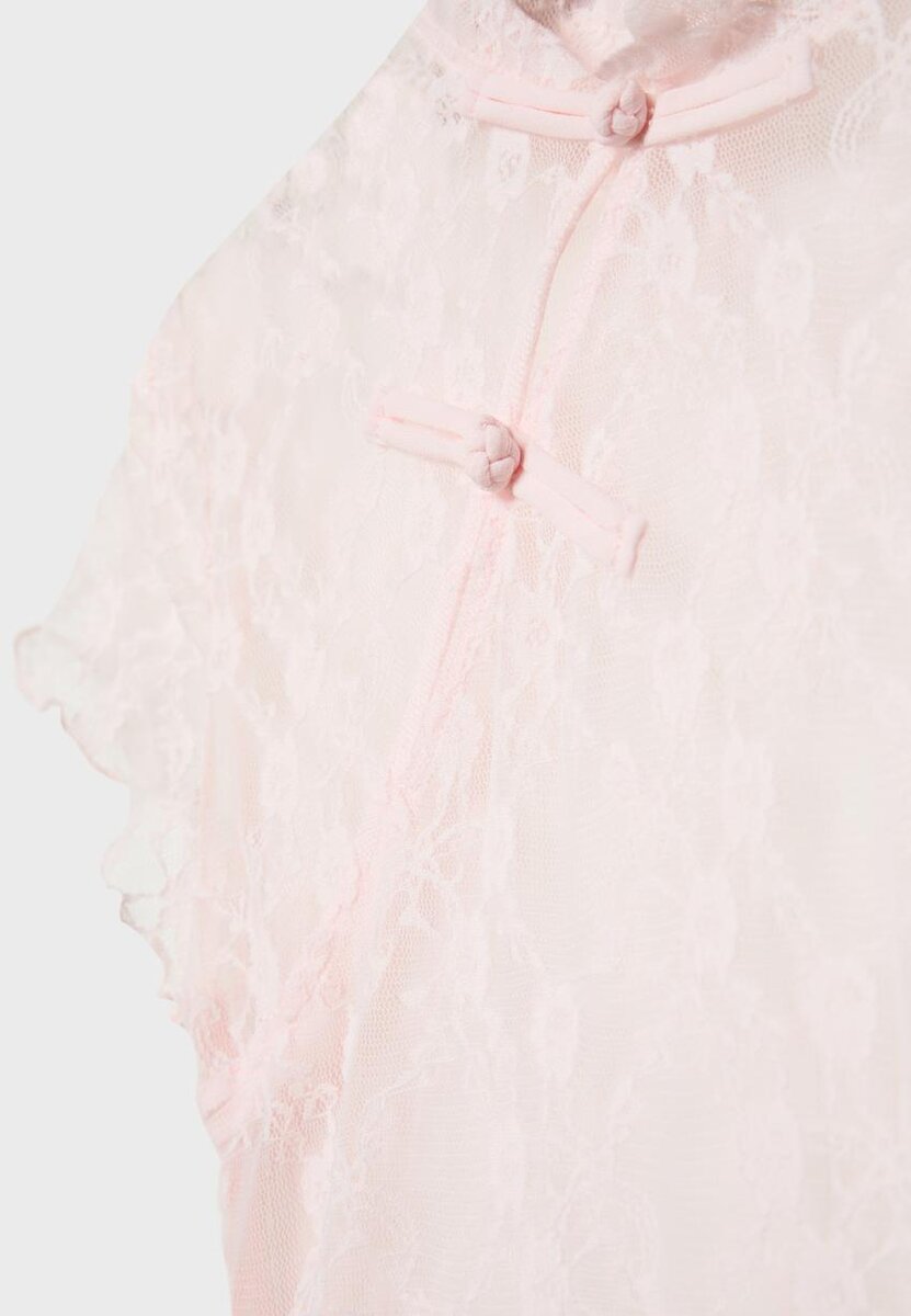 Přiléhavé tričko z krajkové látky. Stojatý límec a krátké rukávy. Zapínání vpředu na knoflíčky u krku. Nastavitelný spodní lem s bočními zavazovacími pásky. K dispozici v různých barvách.