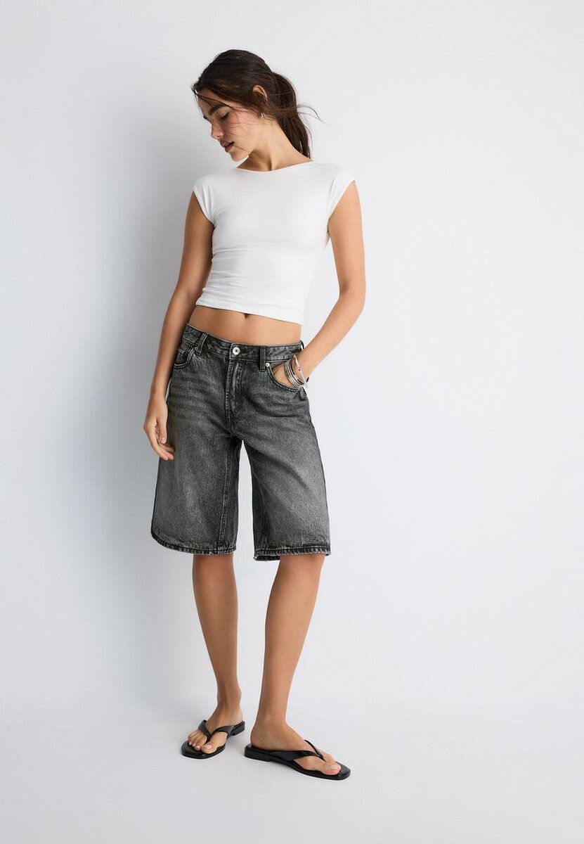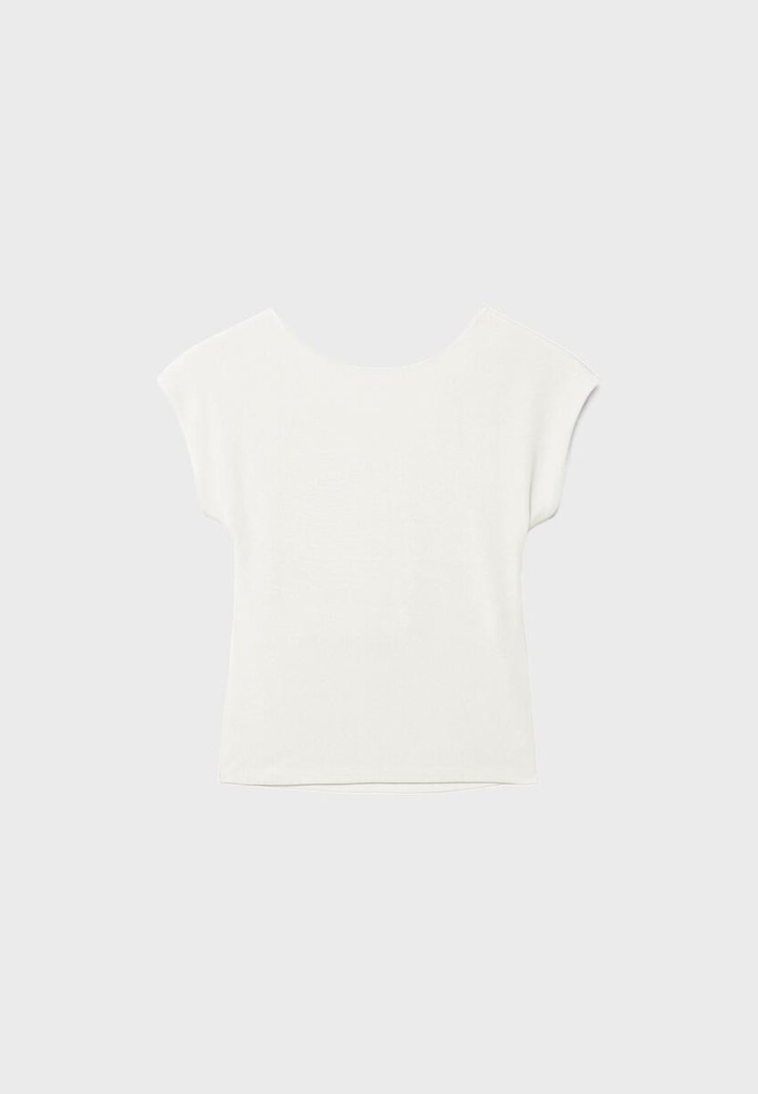 Přiléhavé zkrácené tričko s mini krátkými rukávy a kulatým výstřihem. Má otevřená záda. K dispozici v celé řadě barev.
