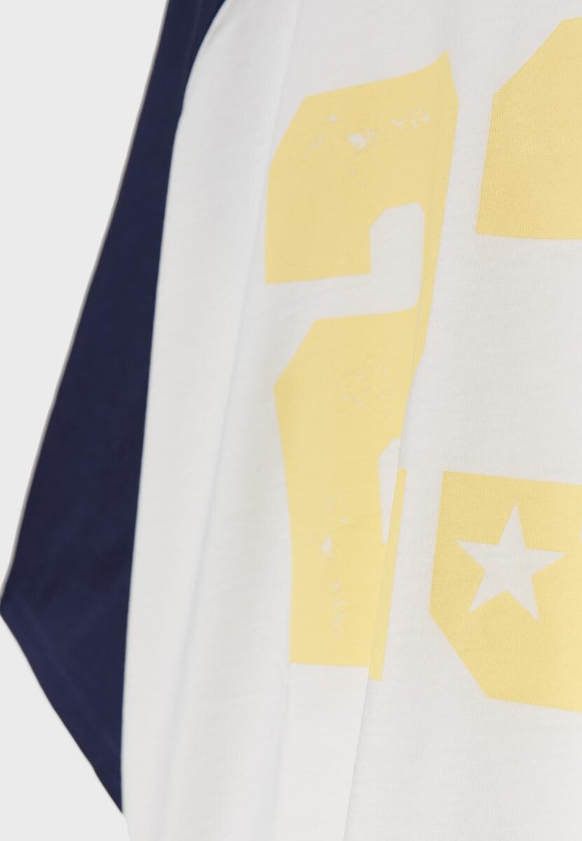 Tričko s pravidelným střihem ze 100 % bavlny. Kulatý výstřih. Raglánové rukávy po lokty. Detail potisku na přední straně.