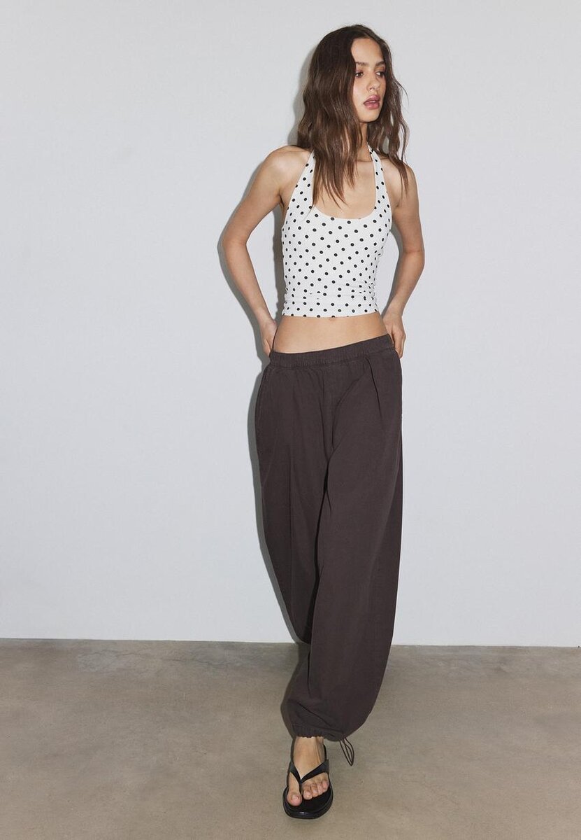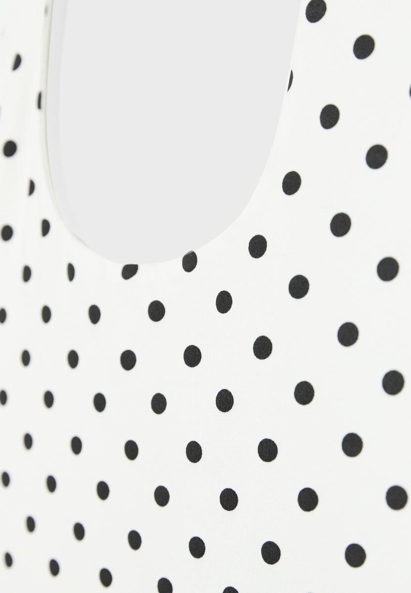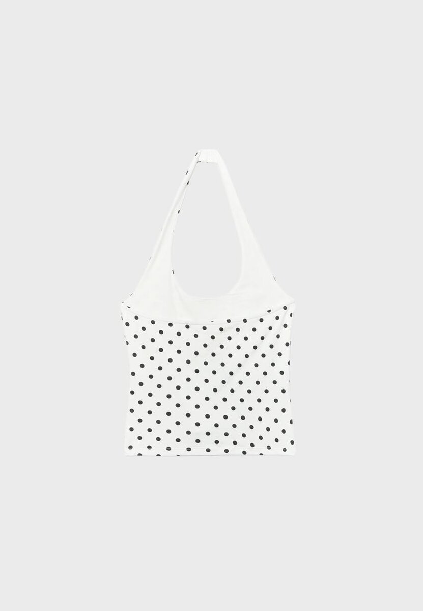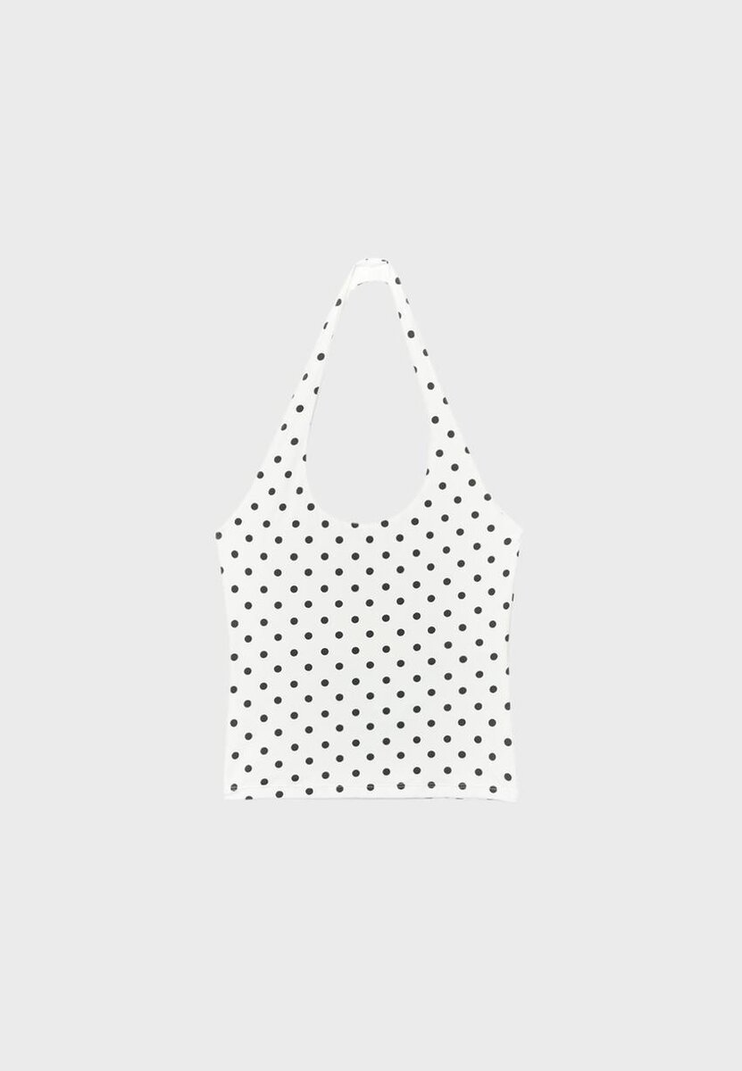 Přiléhavé tričko s puntíkovaným potiskem, výstřihem za krkem, kulatým výstřihem a odhalenými zády.