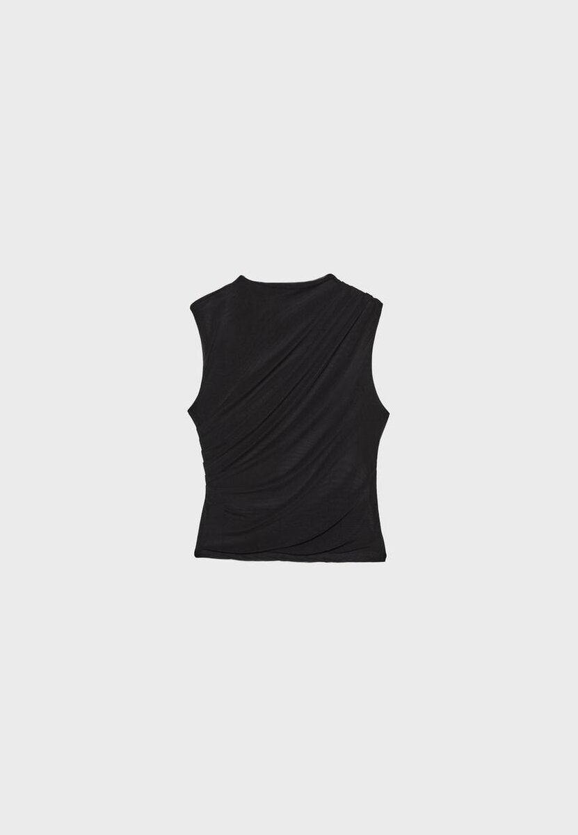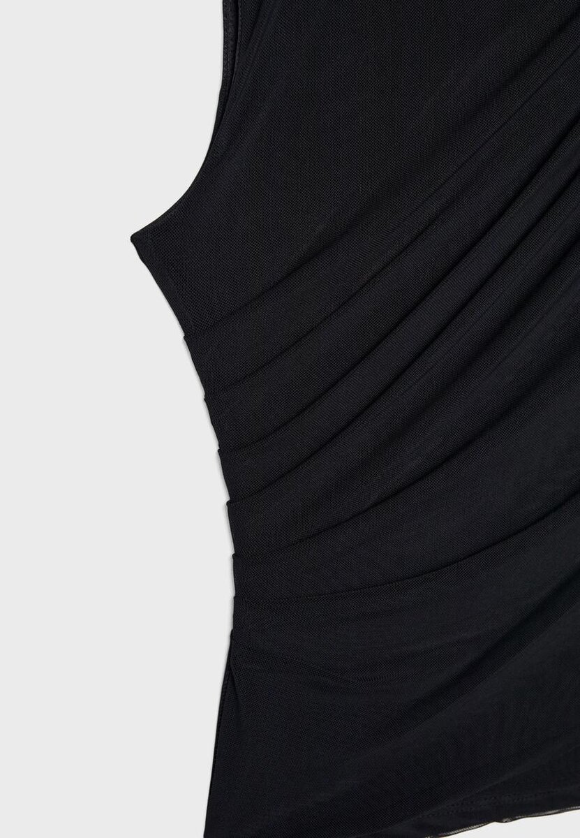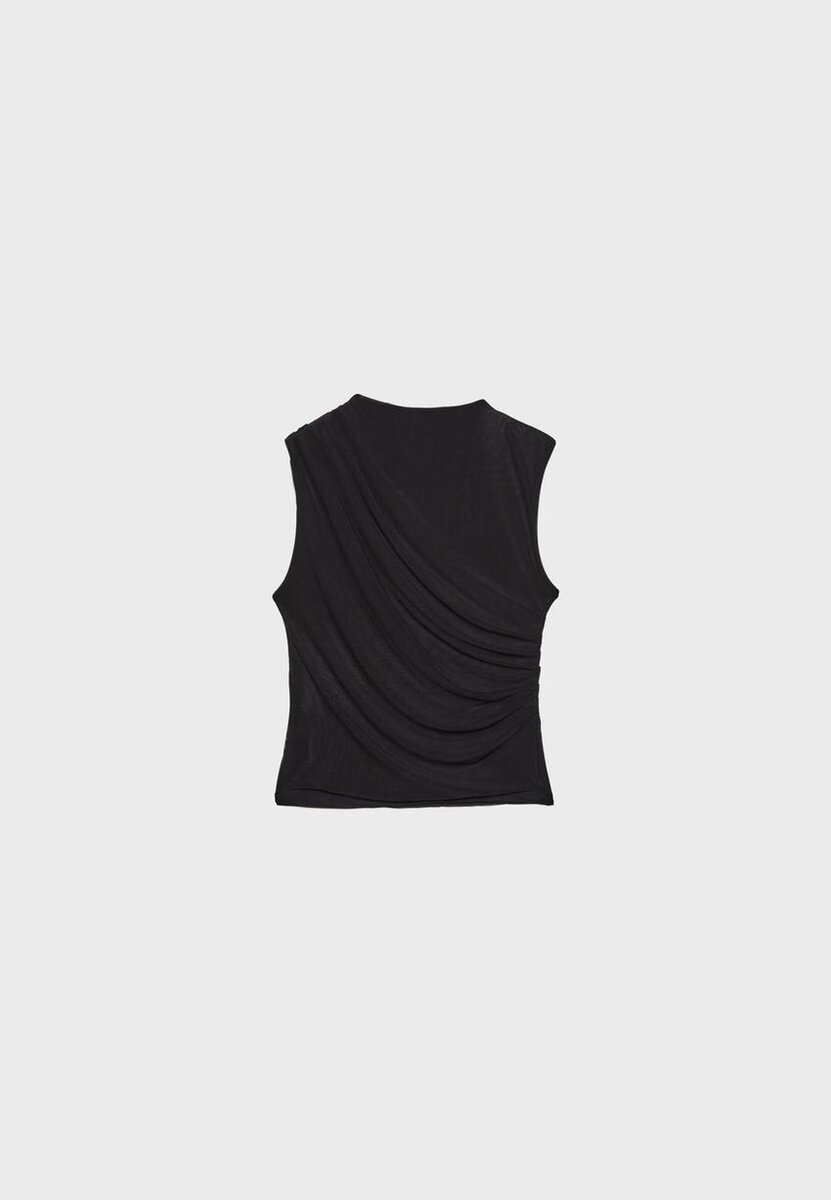 Tričko vyrobené z tylu s vnitřní podšívkou. Má kulatý výstřih a je bez rukávů. Detail drapované látky. K dispozici v různých barvách.