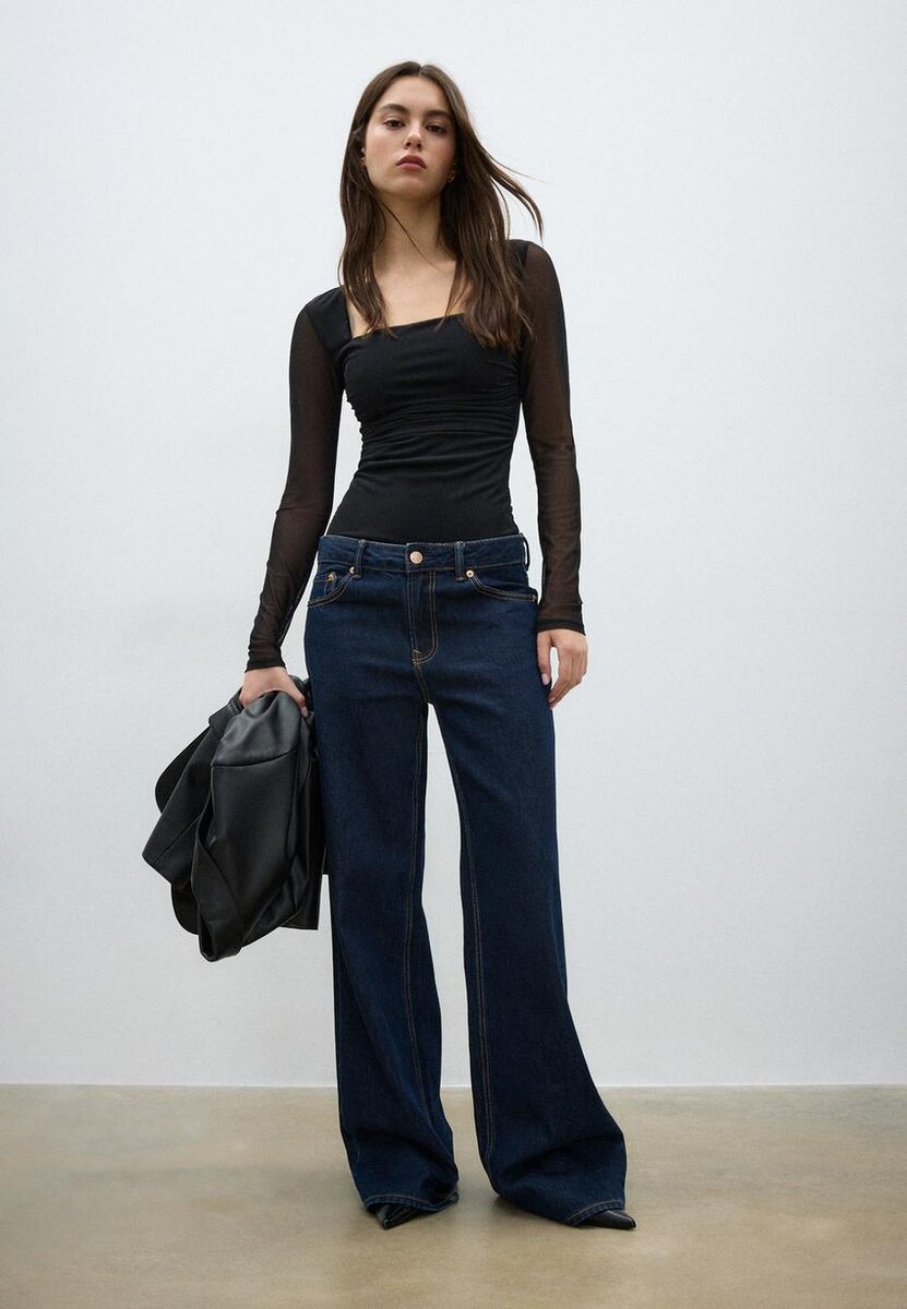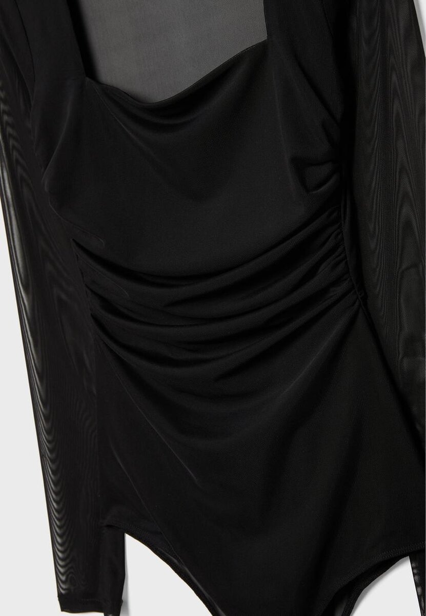 Přiléhavé body z tylu. Má čtvercový výstřih a dlouhé rukávy s poloprůsvitným povrchem. Na boku je nařasený detail. Zapíná se dole na patentky. K dispozici v různých barvách.