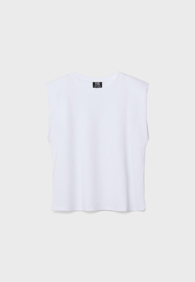 Basic tričko standardní délky s volným střihem. Kulatý výstřih a bez rukávů. S vycpávkami na ramenou. K dispozici v celé řadě barev.