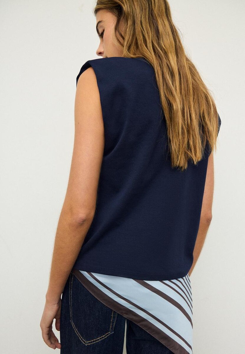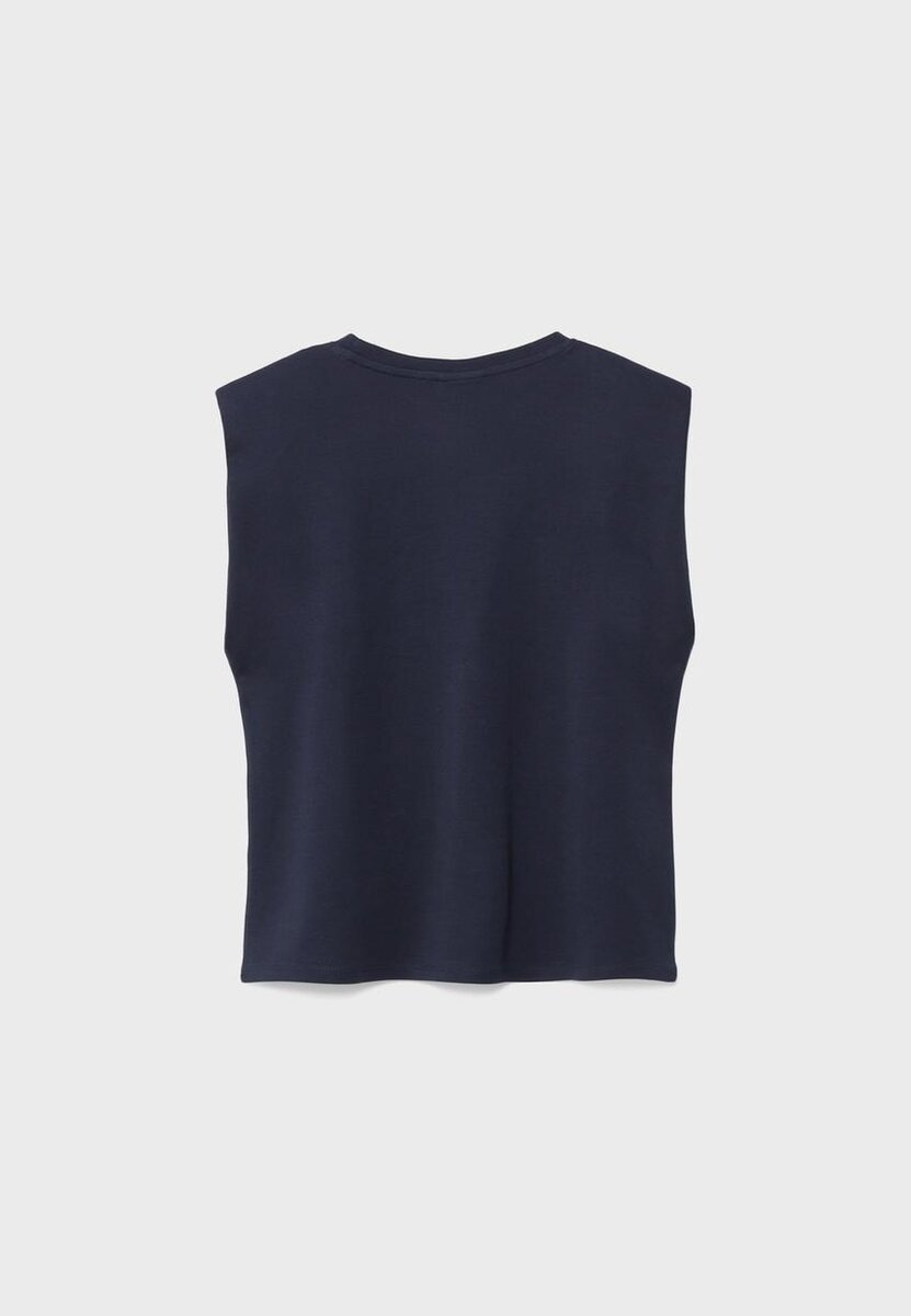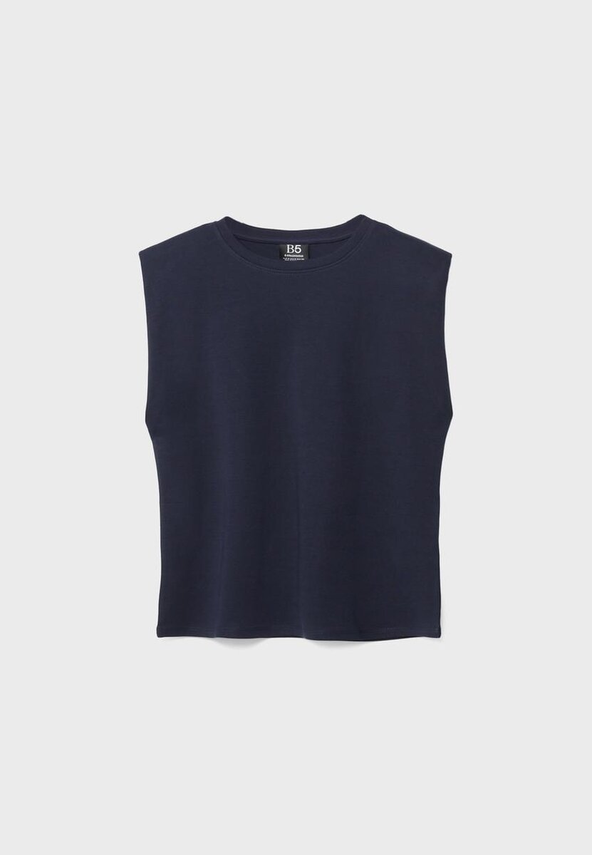Základní tričko s volným střihem a standardní délkou. Kulatý výstřih a bez rukávů. S vycpávkami na ramenou. K dispozici v různých barvách.