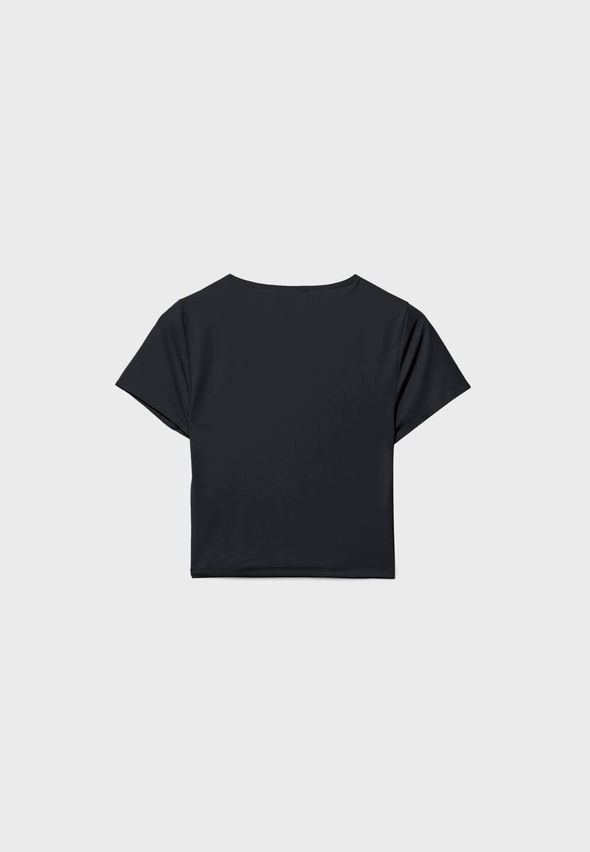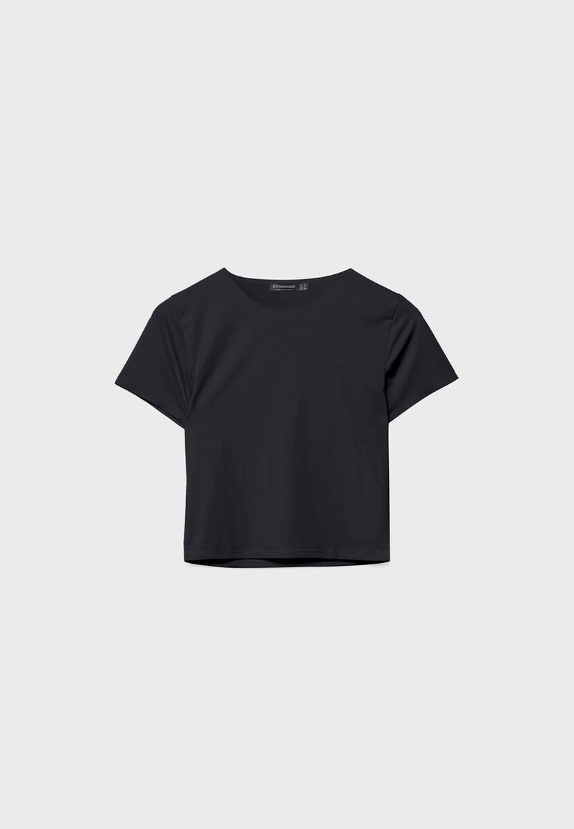 Přiléhavé zkrácené tričko vyrobené ze směsi polyamidu. Kulatý výstřih a krátké rukávy.